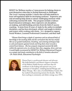 RESET for WellnessTM is a Continuing Education program for professionals that was developed by Dianne A. Fanti and teaches essential life skills through the healing and expressive arts. It includes evidence-based and field tested techniques that stem from 20 years of study in 8 disciplines. Visit: resetforwellness.com or fothnrc.org for more information.